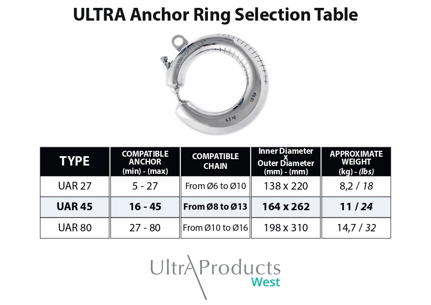 •  In anchoring with limited scope (busy anchorage or limited anchorage area), the ULTRA Anchor Ring increases safety by adding weight to the anchoring system.