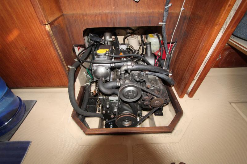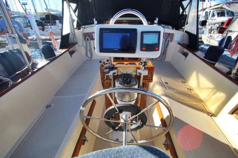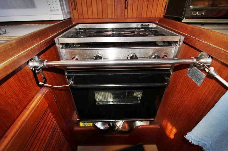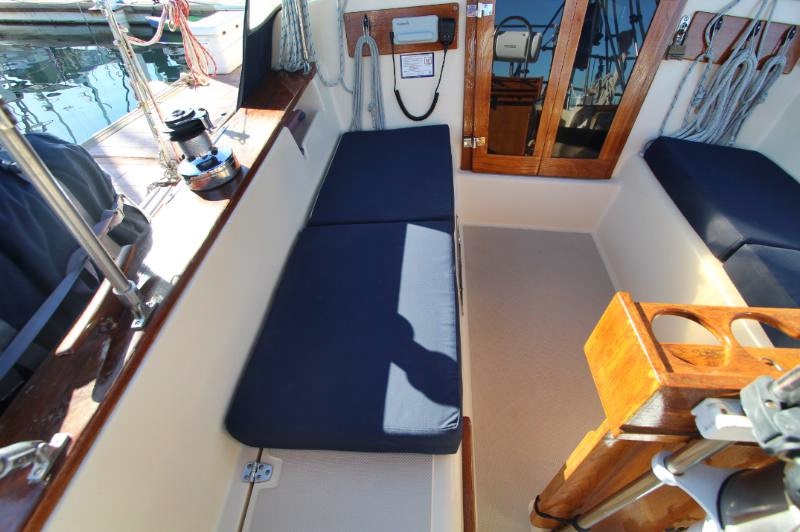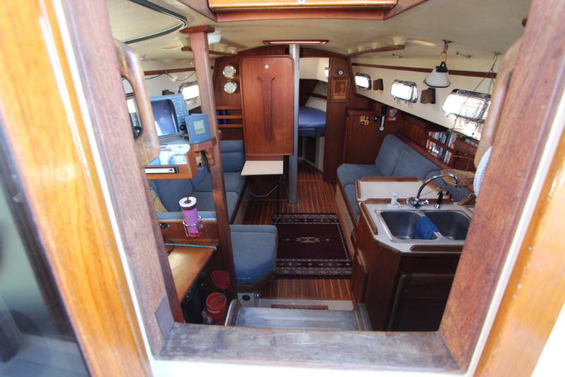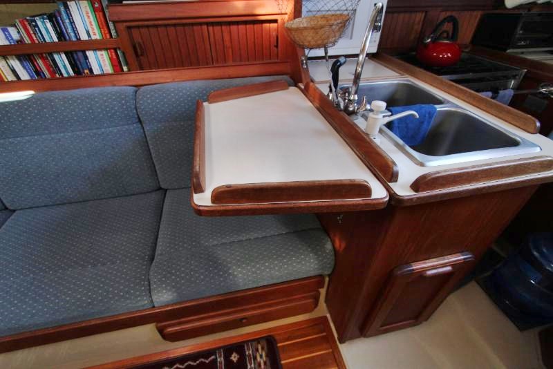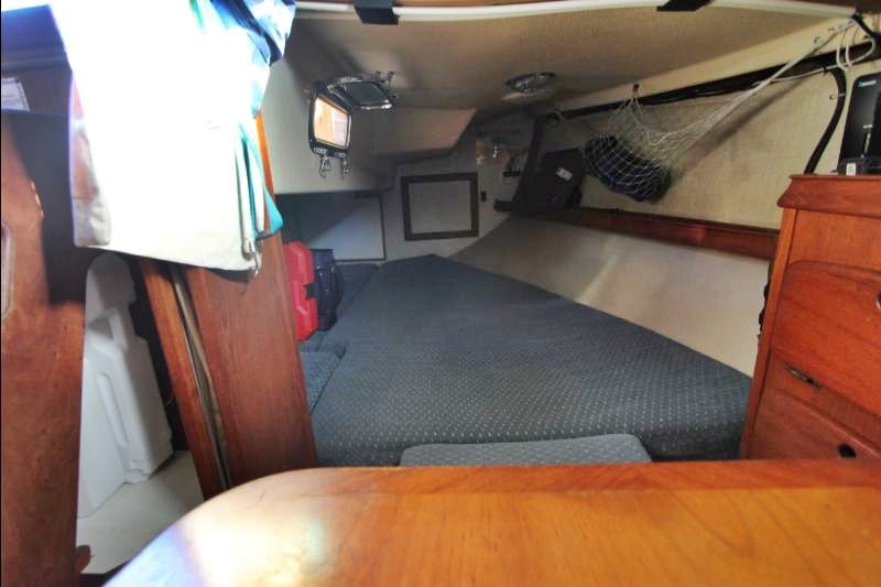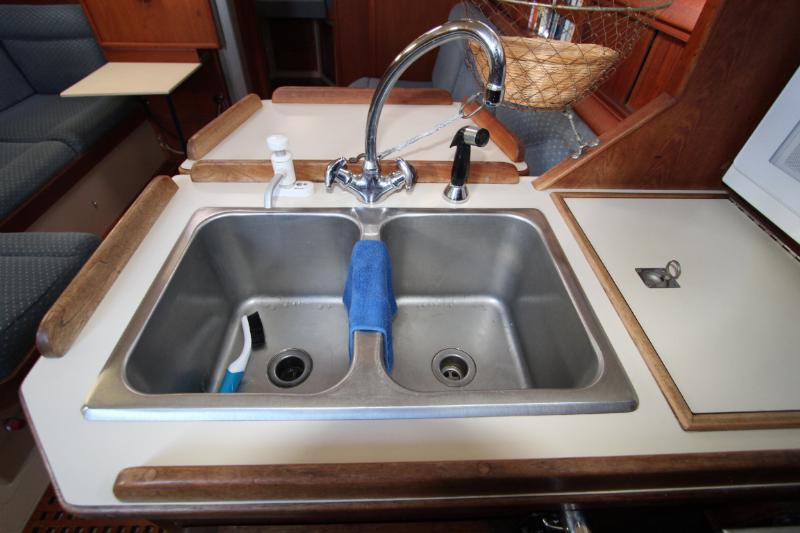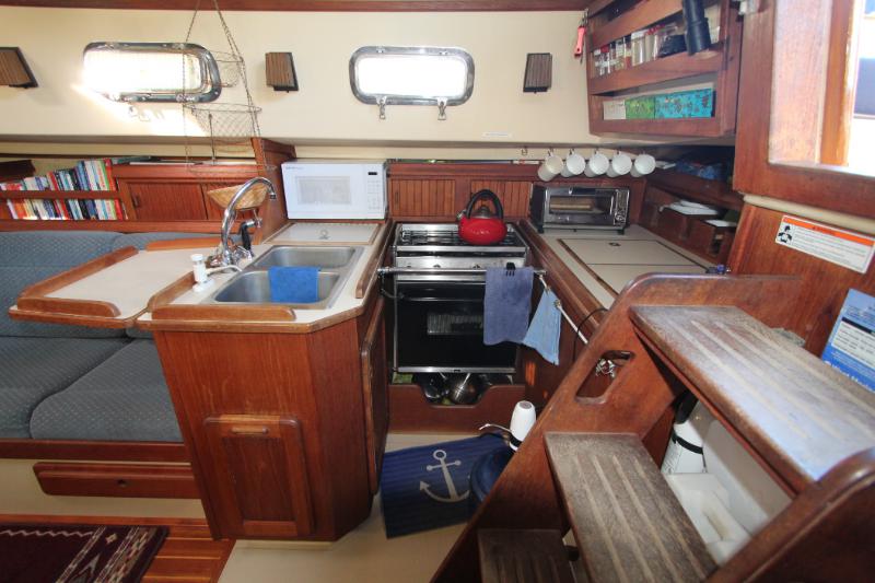 The galley is to starboard of the companionway entrance, with a 2-burner propane stove top with steel safety bar, microwave, deep double stainless-steel sink, and top loading fridge/freezer allow for easy meal preparation when on shore power. The navigation station is to port with a huge quarterberth behind. Storage abounds below the berth, as well as in the nav station.