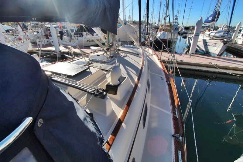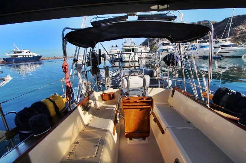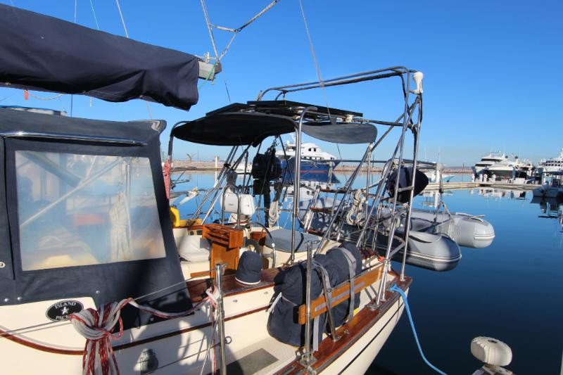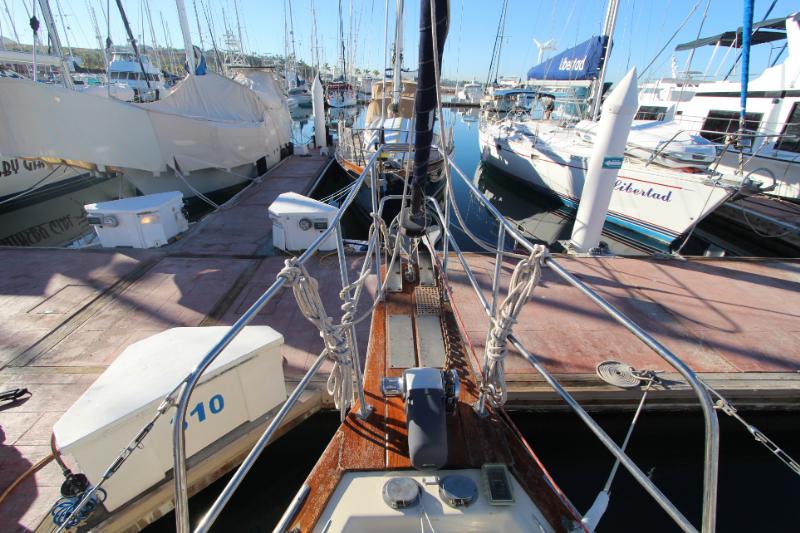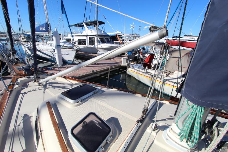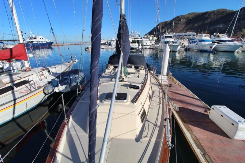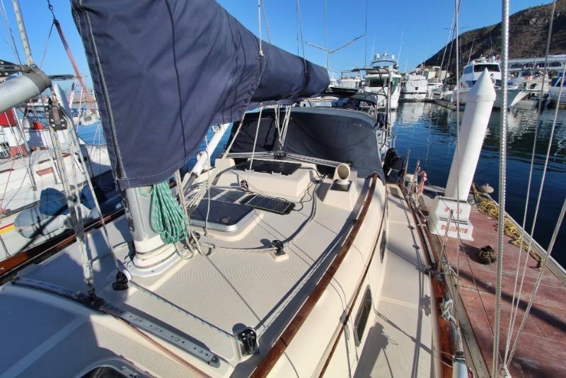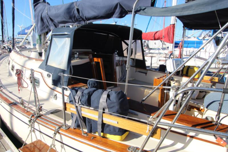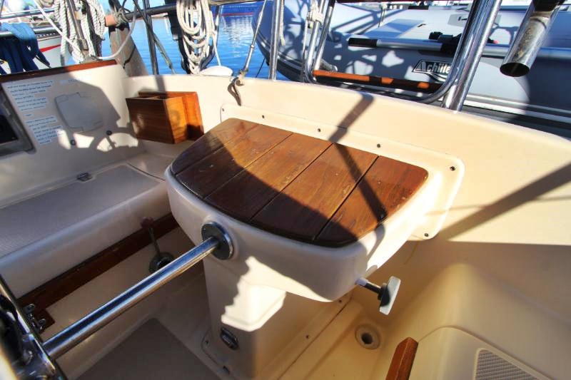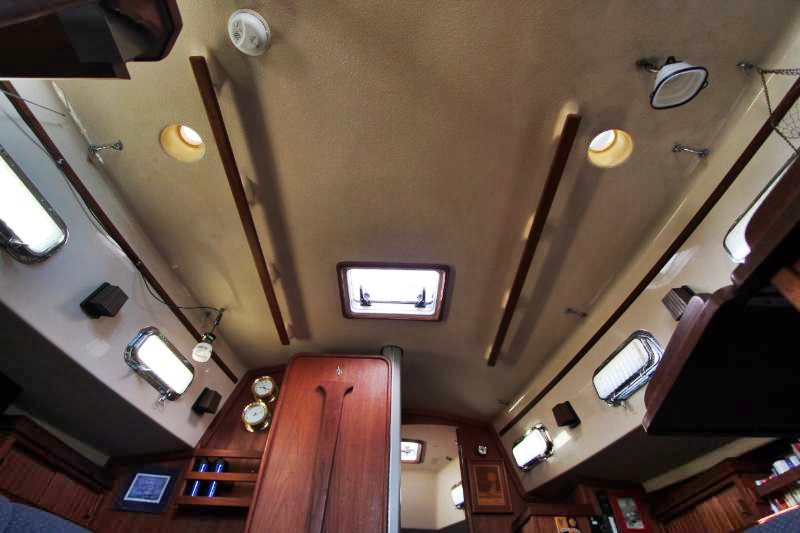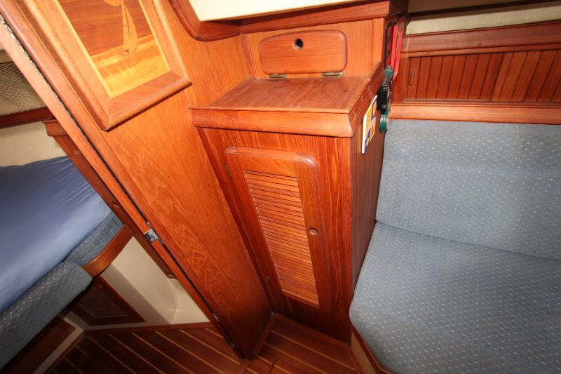 The main salon is large and comfortable with two settees: a single bench-style settee to starboard and an L-shaped settee that converts into a double-berth port side. There is a bulkhead mounted table which folds out to seat 6. There is also a fold-down table mounted behind the galley sink that provides an additional eating and working surface. Beneath and behind the settees you’ll find abundant storage, recessed bookshelves, as well as a storage locker beside the starboard settee. Two ceiling-mounted wooden handrails run the length of the salon for stability and security of movement while underway. Ample portlights, hatch, and ventilation is provided.