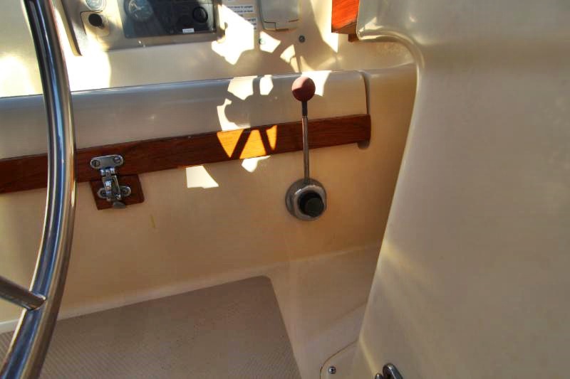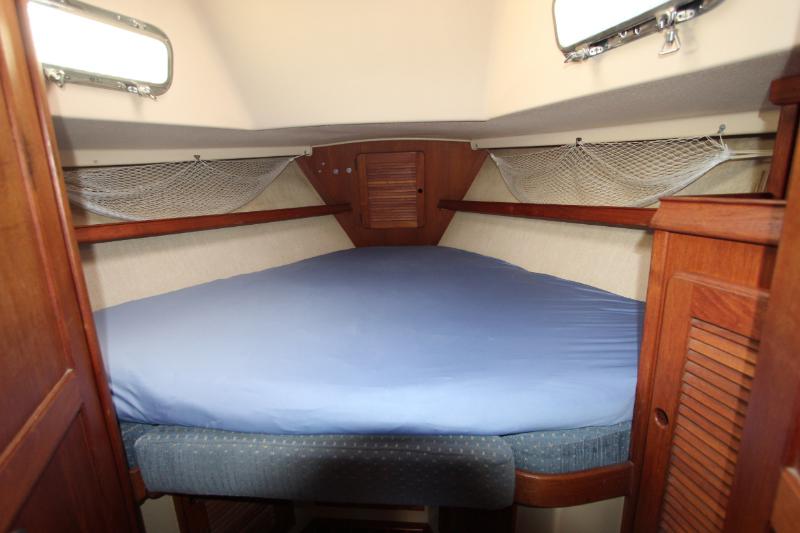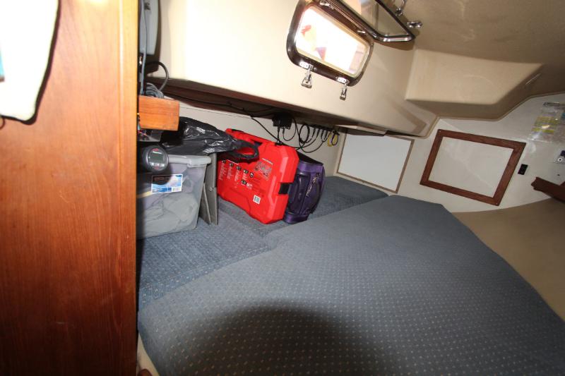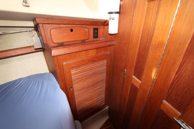 Starting in the forward stateroom, there is a comfortable V-berth for two with storage below the berth and access to the anchor locker. A large hanging locker is found to starboard. The cabin contains outboard shelving, accent lighting, two portlights, deck hatch, electrical outlets – AC and cigarette lighter type (12V) – and smoke/CO detector. Fans and an air conditioning vent also provide plenty of fresh air circulation.