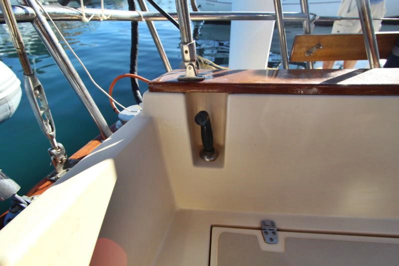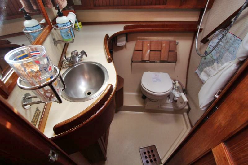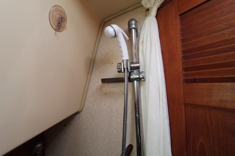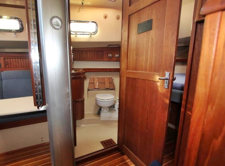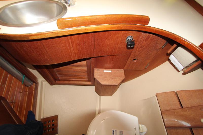 Moving aft and to port is the head, which is accessible from both the V-berth and the main salon. The shower and stainless-steel sink utilize a freshwater system with an air conditioning vent, port window and hatch. The showerhead is wall-mounted on a solid stainless-steel bar. The head includes a Raritan manual commode with integrated shower seat, ample counter space, shower curtain, mirror, sliding cabinetry, towel rack, teak handrail, and electrical outlets (AC and 12V type).